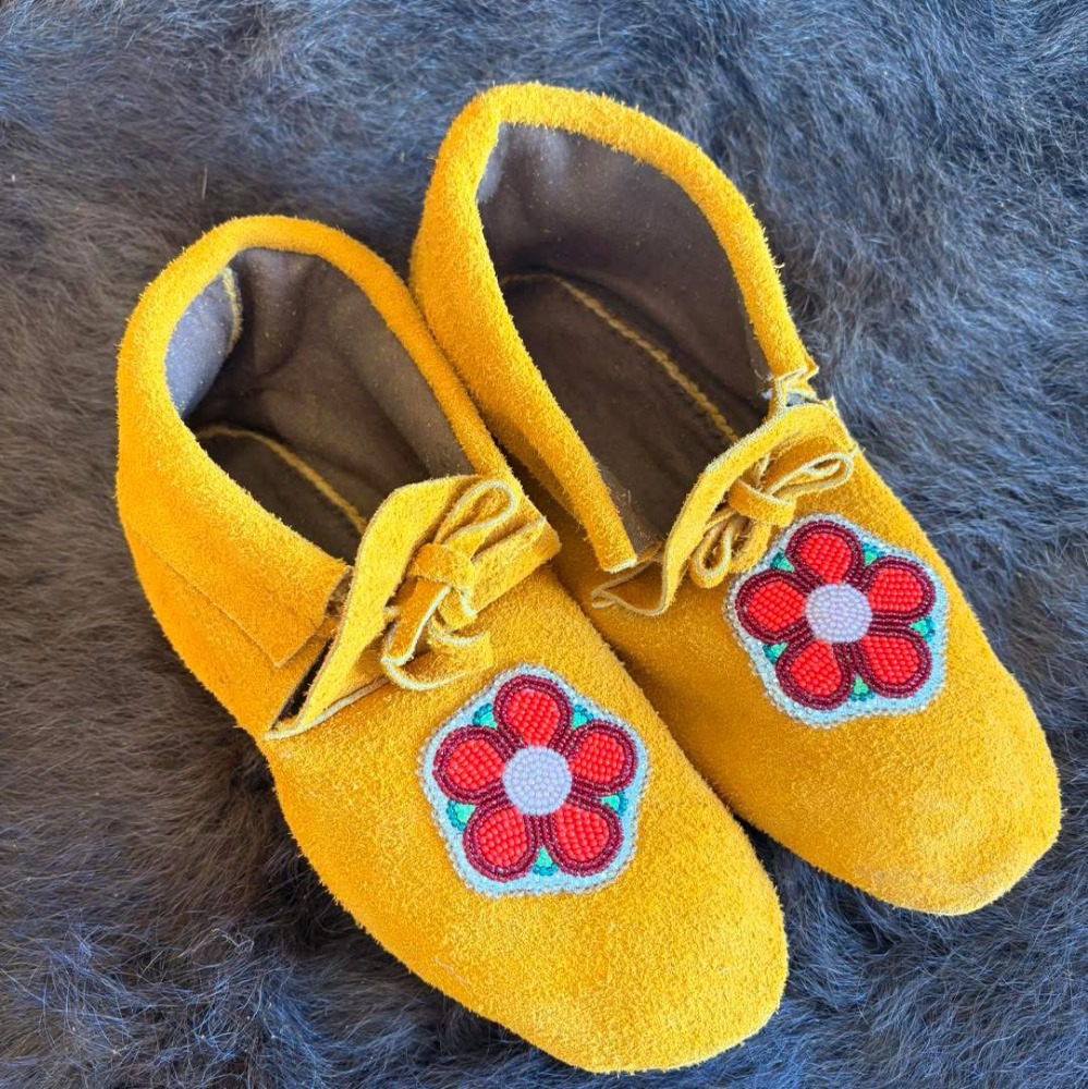 commercial moose hide moccasin ladies Size 10. Handcrafted by Rita Dreaver treaty 6 artist