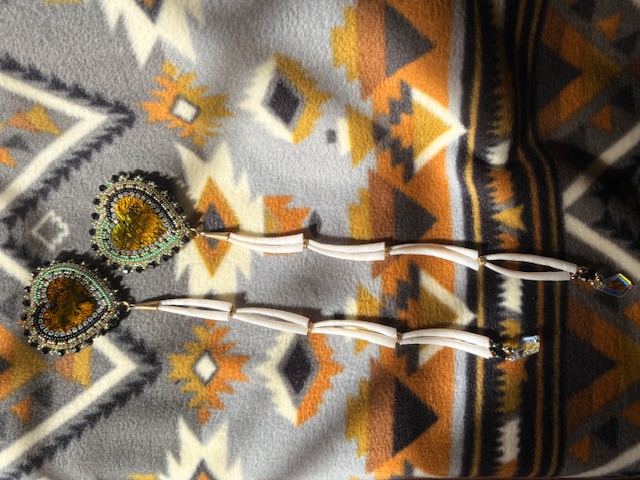 Beaded heart shaped earring with dentallium, diamond shaped charm and rhinestones