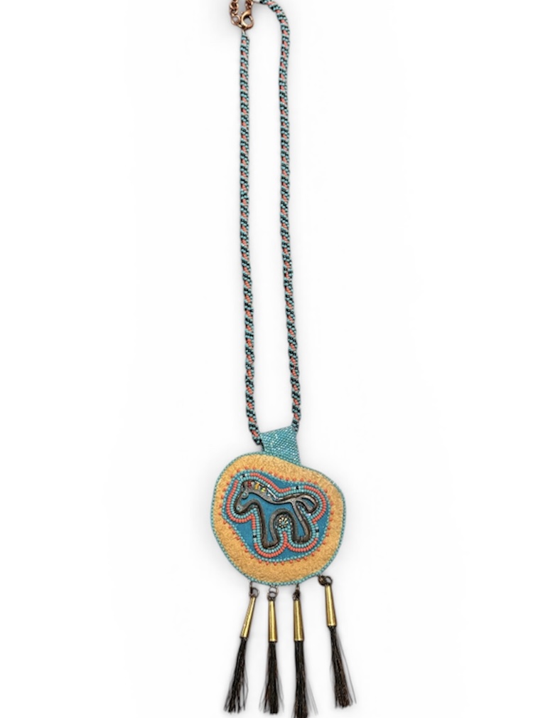 Beautiful twisted peyote necklace with tanned moose hide and beaded horse medallion. Horse hair dangles