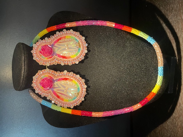 Wrap beaded necklace and beaded cabachon earring set in colours as shown. Wrap beaded necklace approx. 22 inches length. Beaded cabachon earrings approx. 3 inches. Butterfly post.
